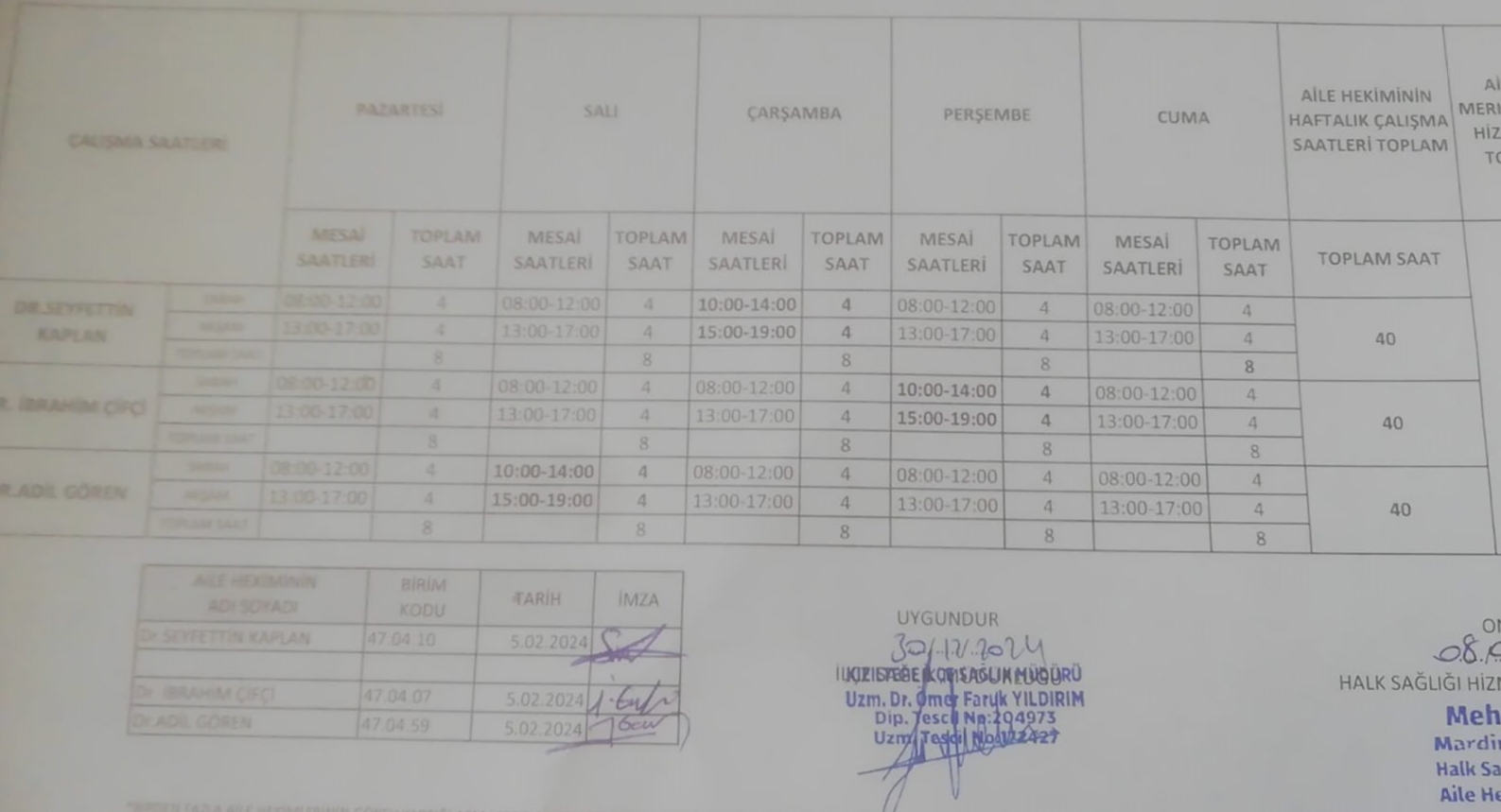Çarşamba: sabah 08.12...13.17 esnek mesai Dr Seyfettin kaplan sabah 10.14...15.19
